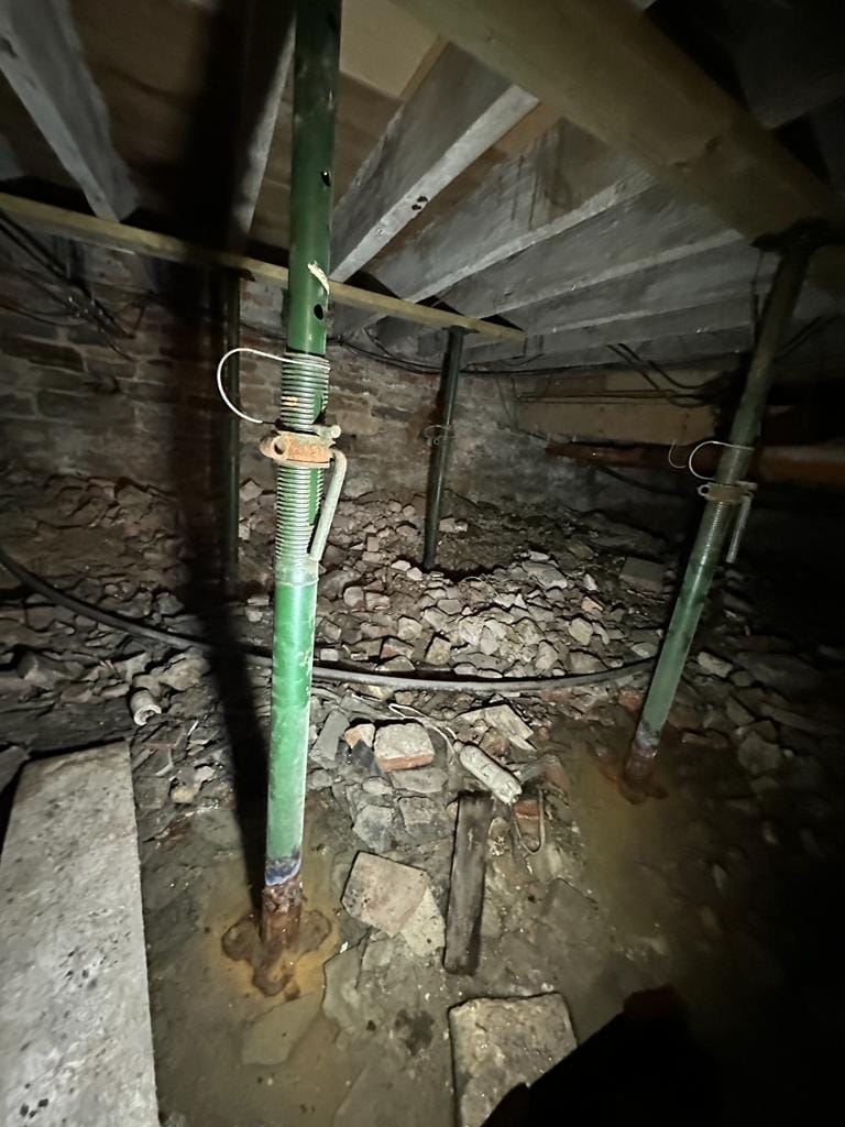 The works were carried out in February this year so not ideal in terms of getting the space dry for works to begin, but once the water was pumped away and the acro props sent in the team set to tanking this area to cover the access points for the water ingress. The oxidised pipes were then all be replaced and the team could begin the work on creating a concrete base and building the block piers and getting the supporting beam in place (remember all of this work is being done working on their knees!)